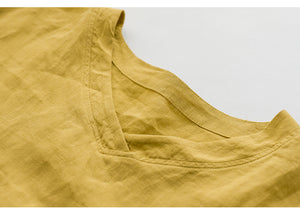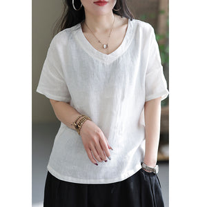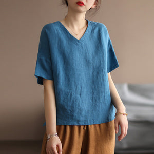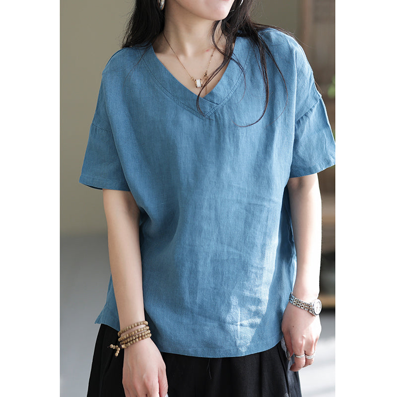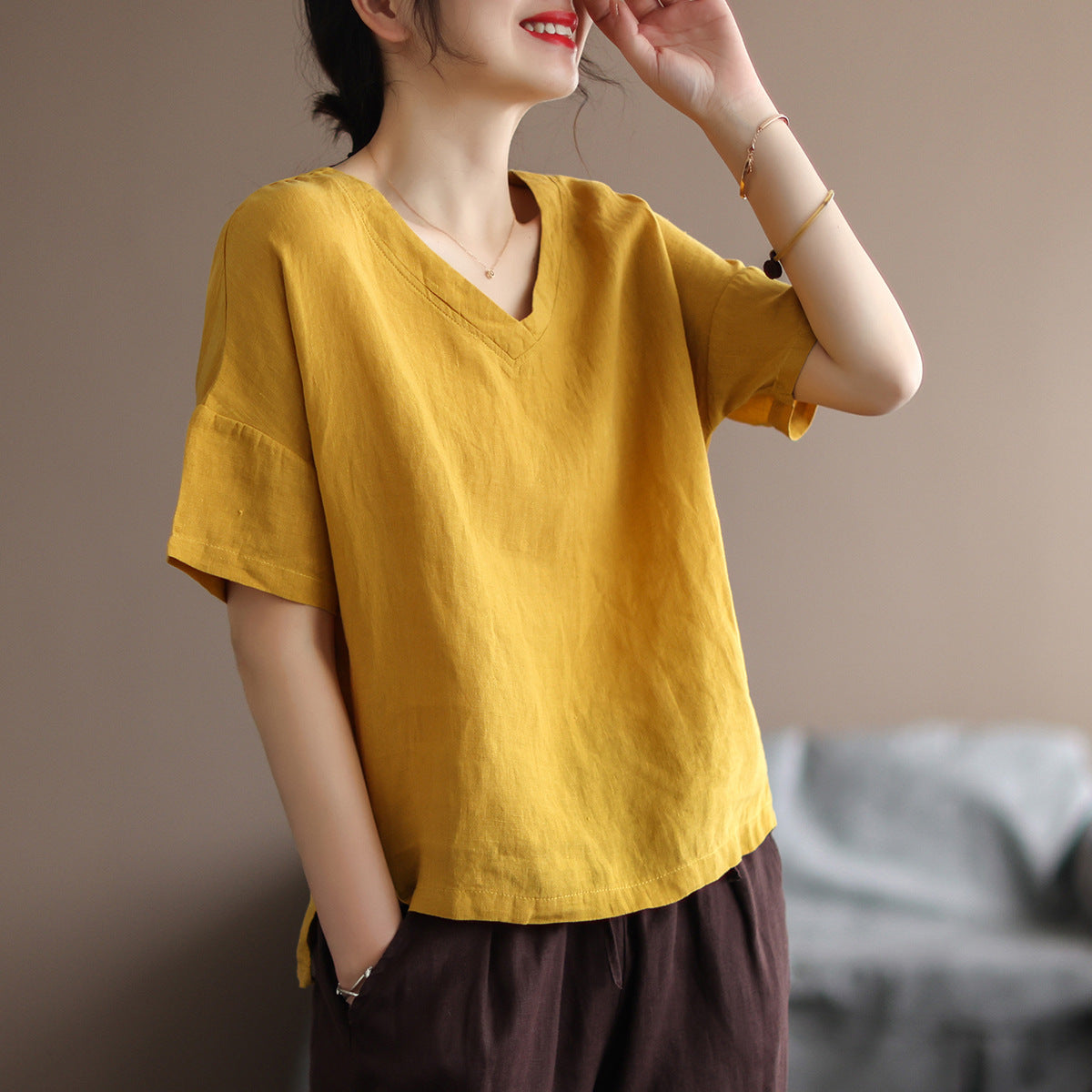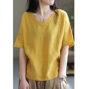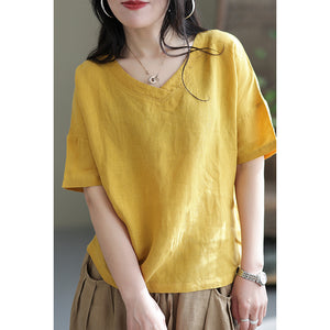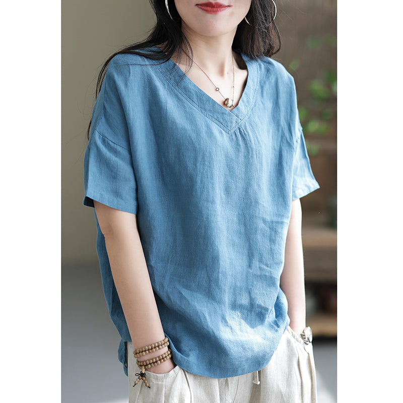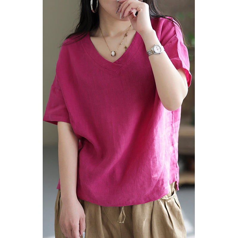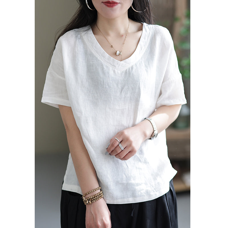 Áo sơ mi linen ngắn tay cổ V một màu - NU6925