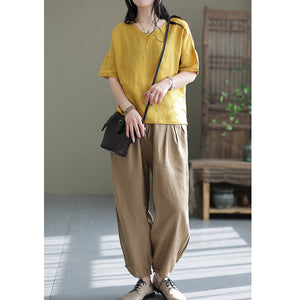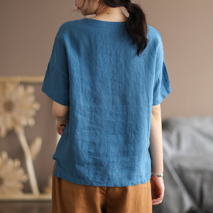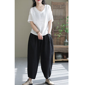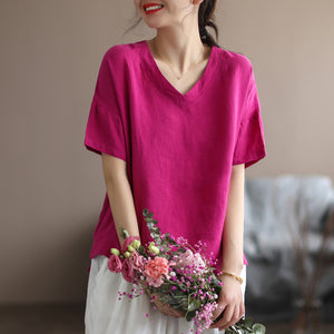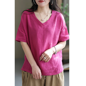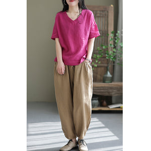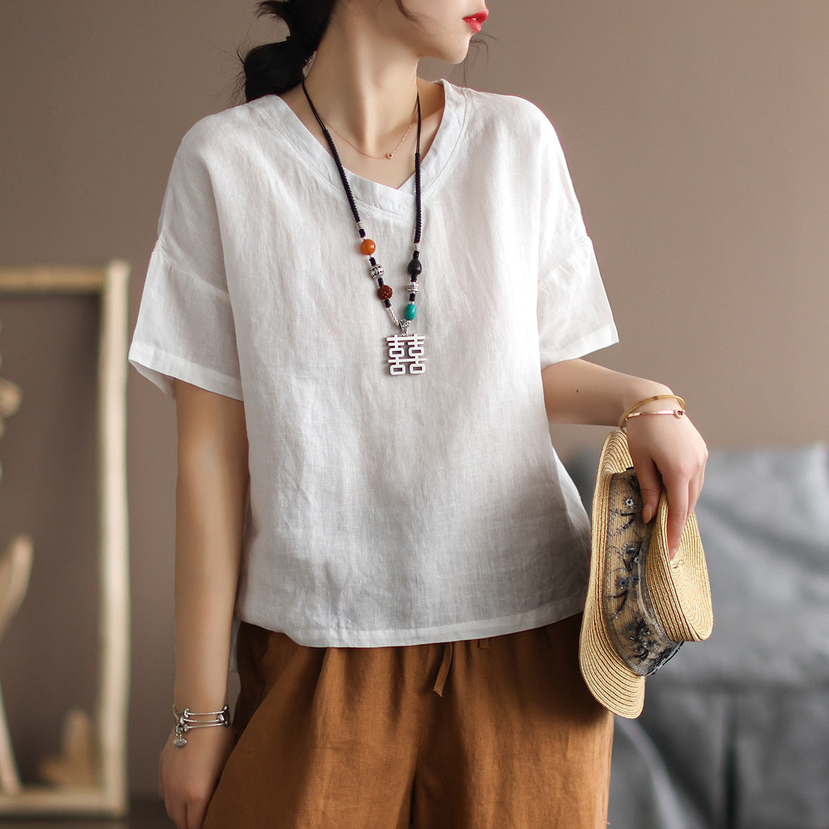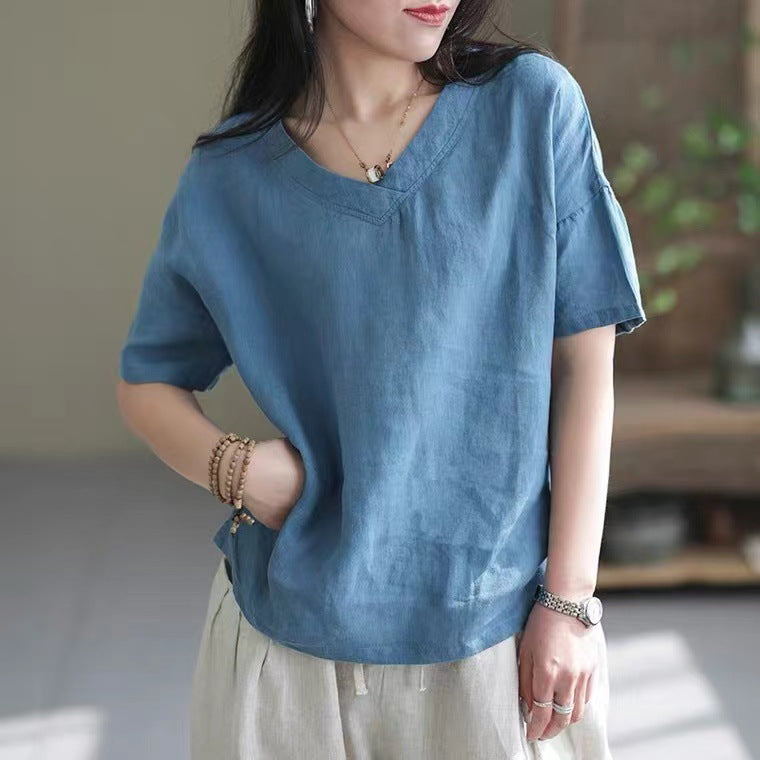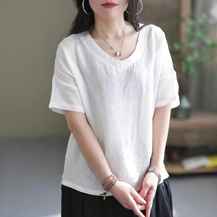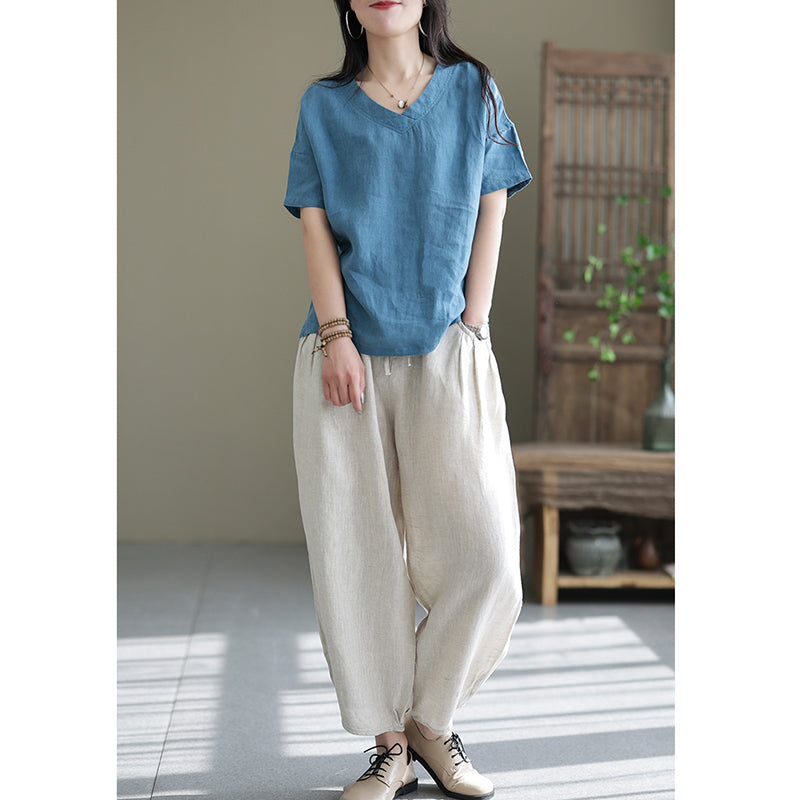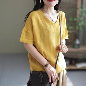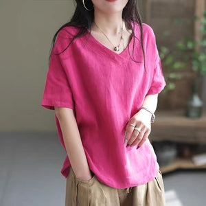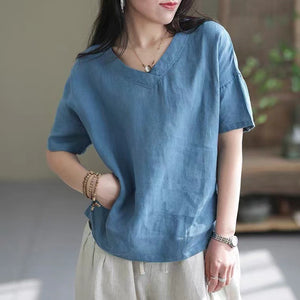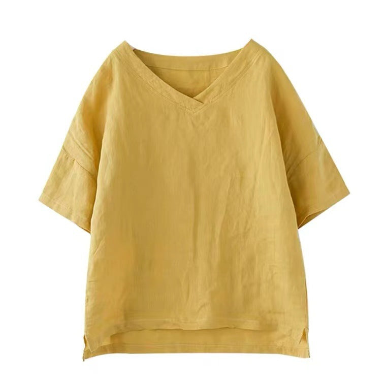 Áo sơ mi linen ngắn tay cổ V một màu - NU6925