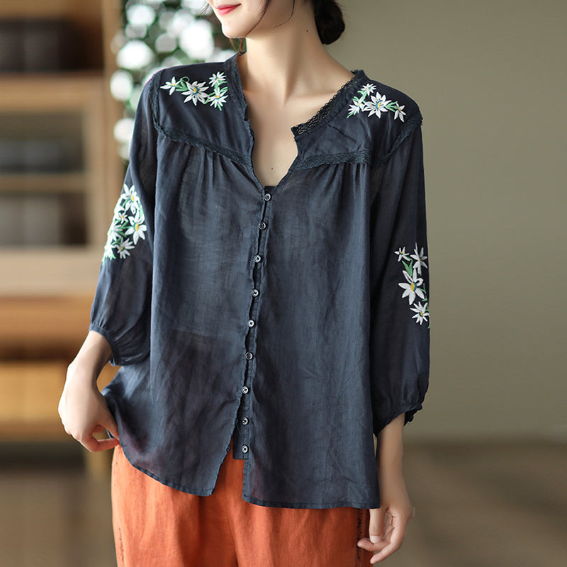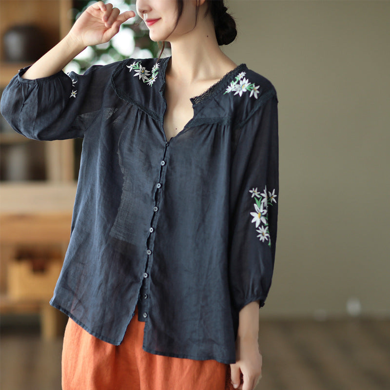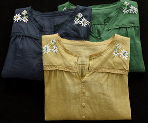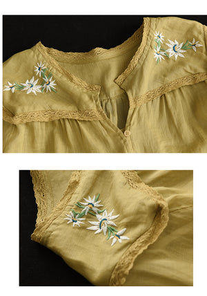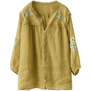 Áo sơ mi linen ngắn tay cổ V thêu hoa lá đối xứng - NU7526