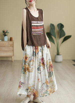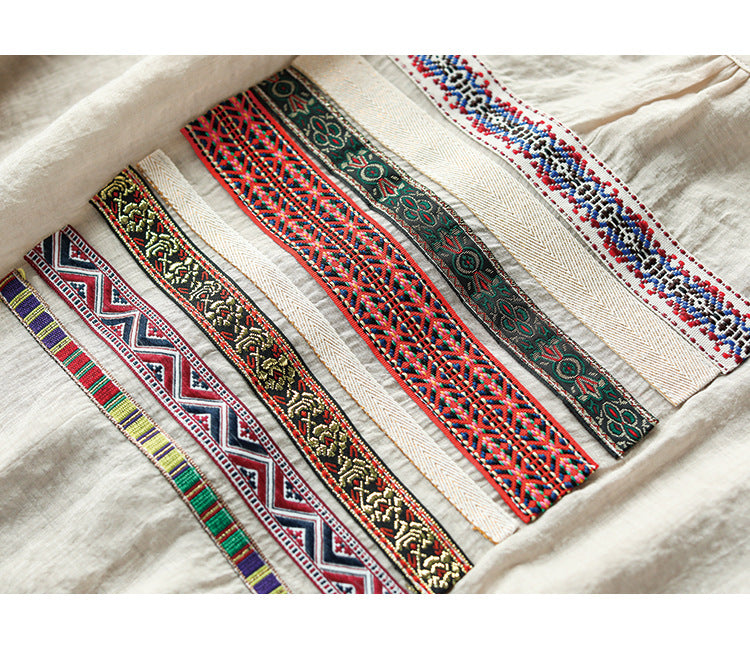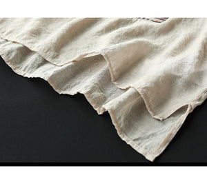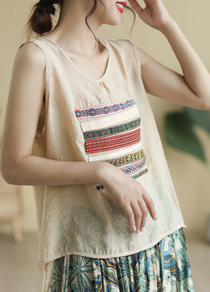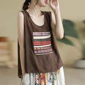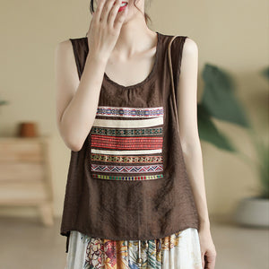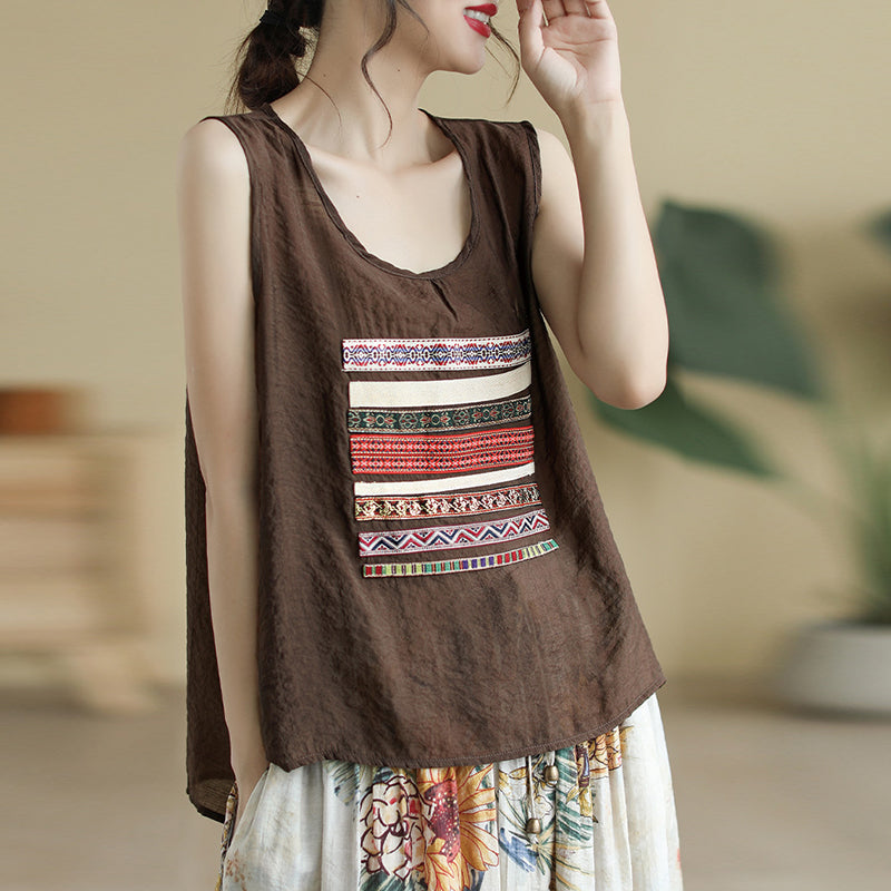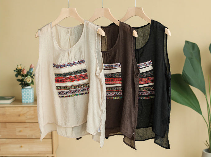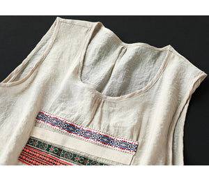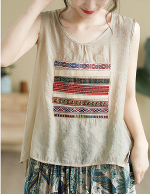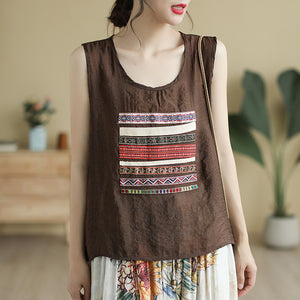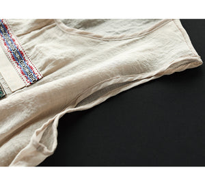 Áo T-shirt linen sát nách cổ tròn thêu sọc hoa văn thổ cẩm - NU7453