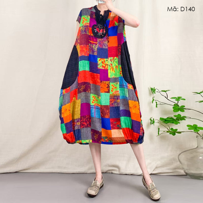 Đầm liền linen sát nách cổ V - D139