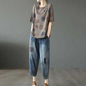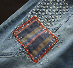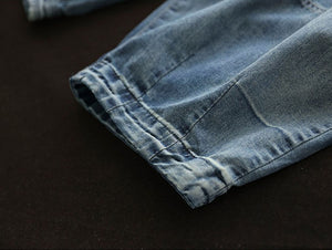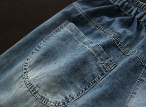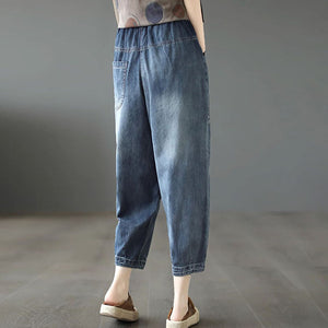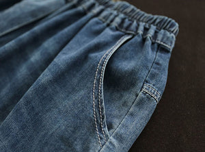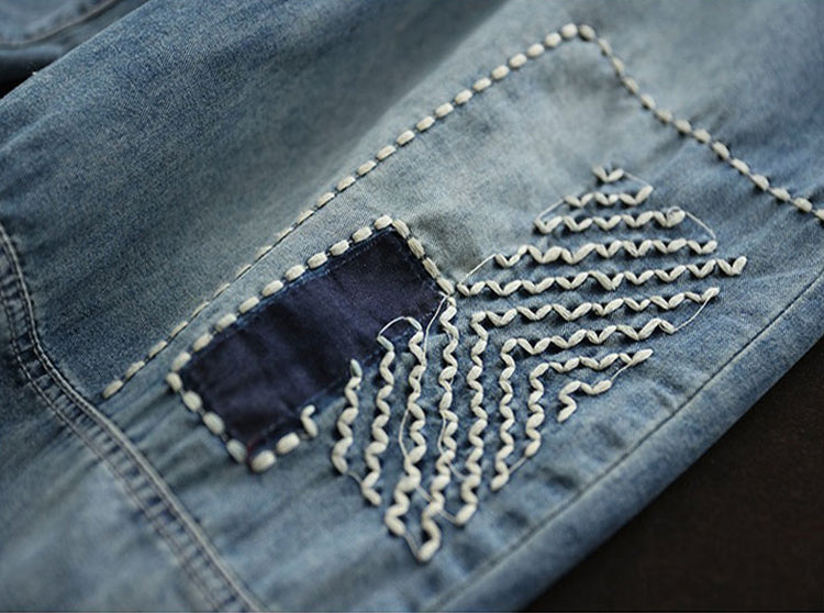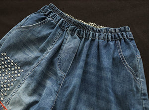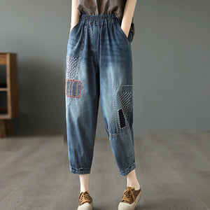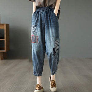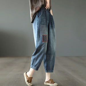 Quần baggy denim lưng thun ống côn thêu hoa văn trừu tượng - NU8679