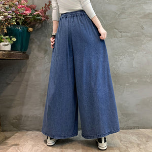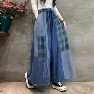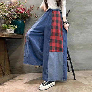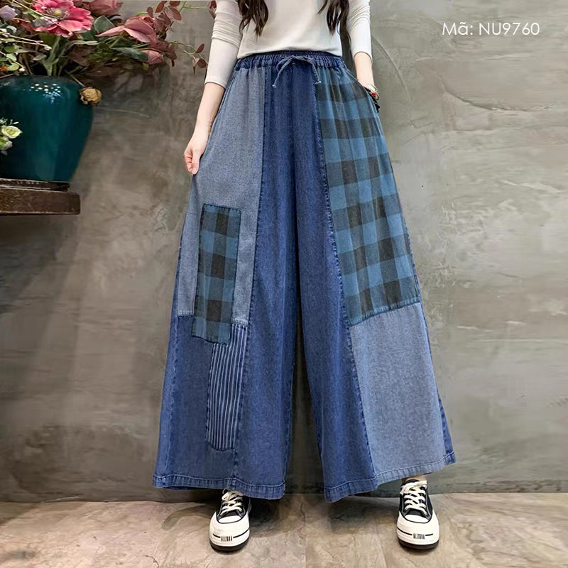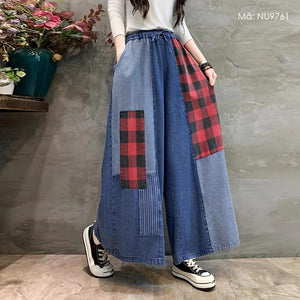 Quần baggy denim lưng thun ống rộng phối caro - NU9760