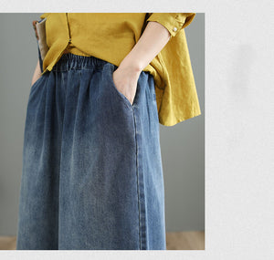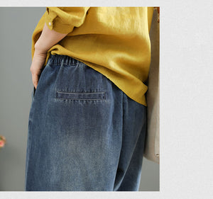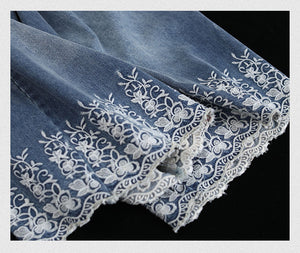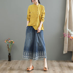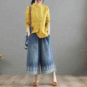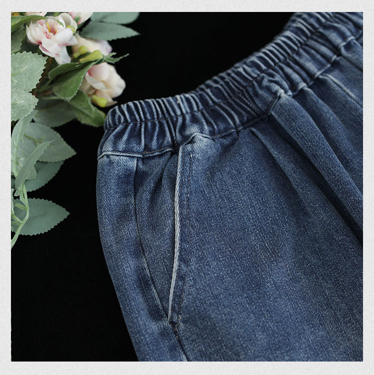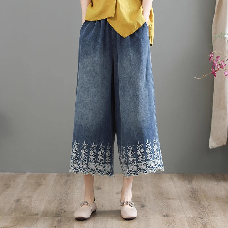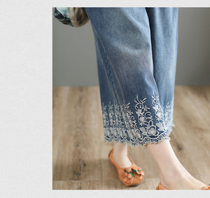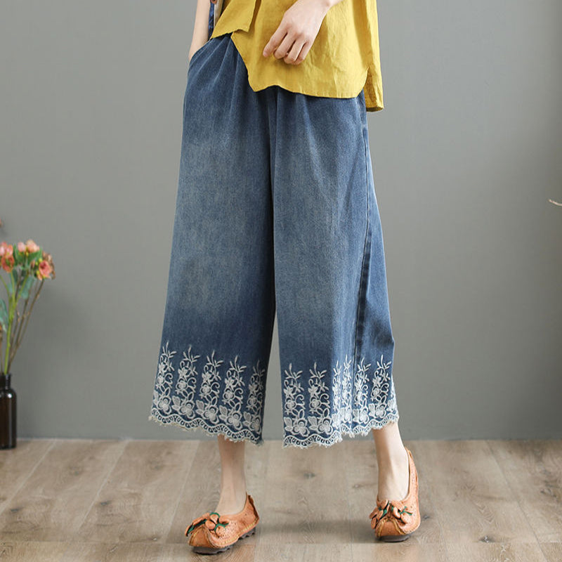 Quần baggy denim lưng thun ống rộng thêu hoa lá - NU8567