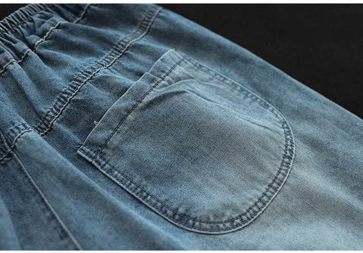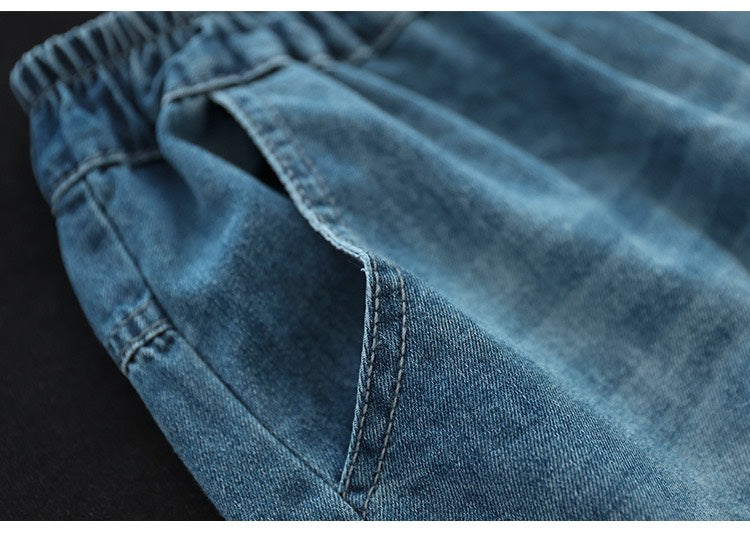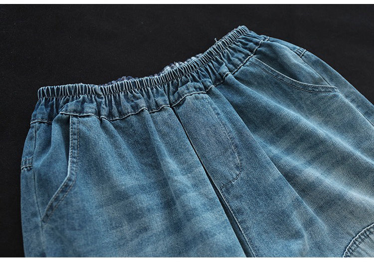 Quần baggy lửng denim lưng thun thêu hoa lá đối xứng - NU8884