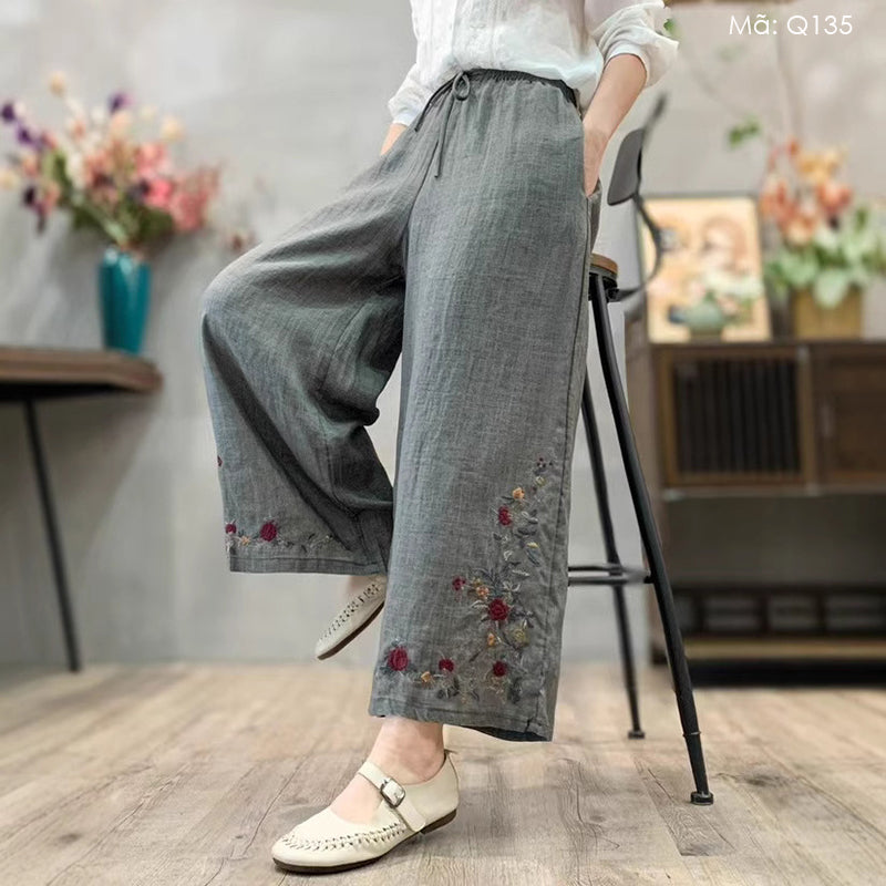 Quần baggy linen lưng thun dây rút ống rộng thêu dây hoa - Q134