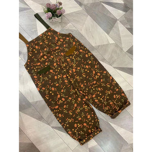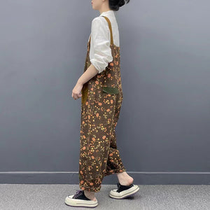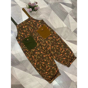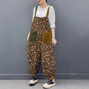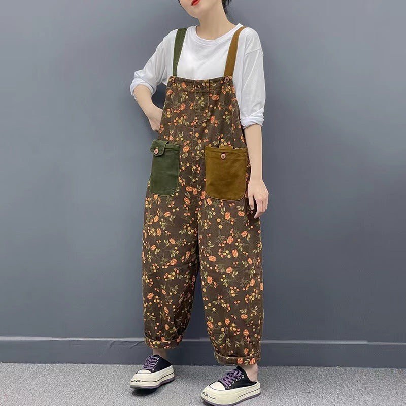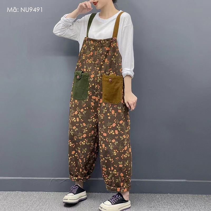Quần baggy yếm denim in hoa lá túi kiểu lệch màu - NU9491