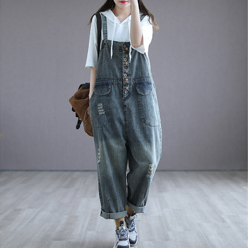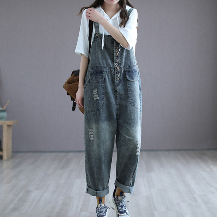 Quần baggy yếm denim retro kiểu nhiều nút - NU6630