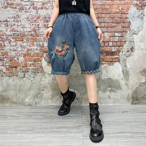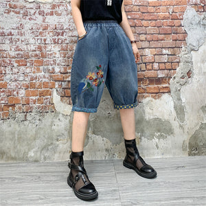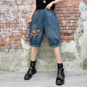 Quần sooc denim lưng thun thêu chú chim và cành hoa - NU8203